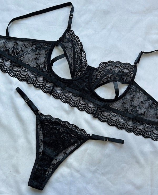 Conjunto de encaje y puntilla con aro y detalle de abertura en el busto. Regulable en hombros y less, broche en espalda