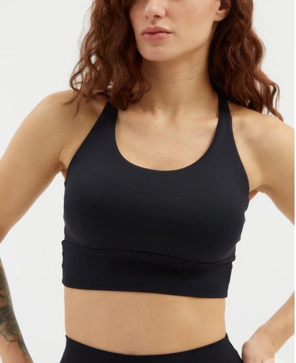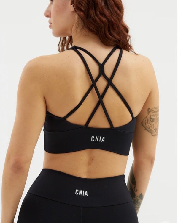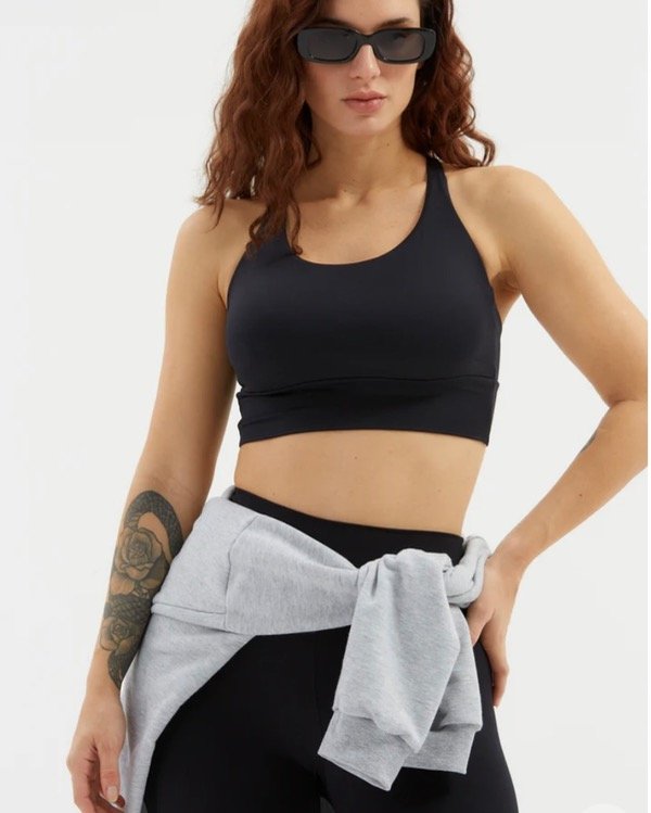 Top de microfibra con espalda de tiras finas y fijas cruzadas. Confeccionado con doble tela embolsada, lleva elástico en bajo busto para asegurar mejor sostén y tiene bolsillo para taza en su interior.